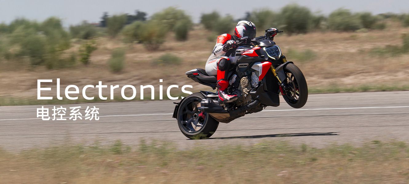 Diavel V4 RS的电子套件包含三种动力模式(高/中/低)、杜卡迪牵引控制(DTC)、杜卡迪车轮控制(DWC)、杜卡迪快速换挡系统(DQS)2.0及四种骑行模式:首次引入Diavel系列的塞车模式,以及运动模式、旅行模式和湿地模式。整套系统由全新的杜卡迪弹射起步策略控制,可优化起步表现,充分发挥发动机动力 。专属TFT仪表开机动画进一步强化运动电子系统的视觉表现。