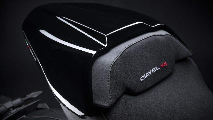 为了最大限度地保持单座布局的整洁,同时又能容纳一名乘客,Diavel V4恢复折叠式脚踏板,保留可伸缩式后把手,这两种解决方案能够完美地将时尚性和实用性融为一体。
