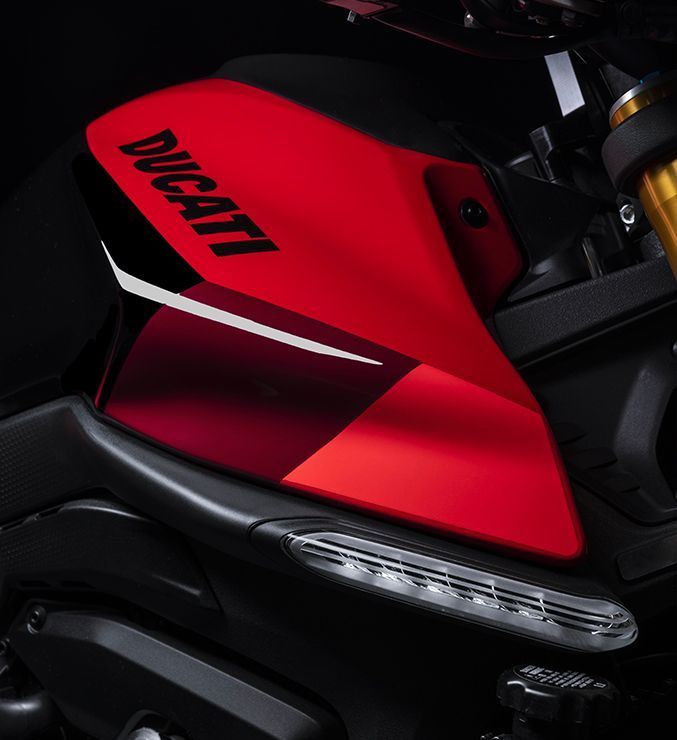 该涂装融合了厂队 Desmosedici GP 2022 年的颜色,加强了 Monster SP 的运动性。油箱上的杜卡迪字样会让人想起 Panigale V4 上的图案。红色的座椅与尾部的侧视图相得益彰,副驾驶座套上有 Monster SP 的标志和意大利国旗。