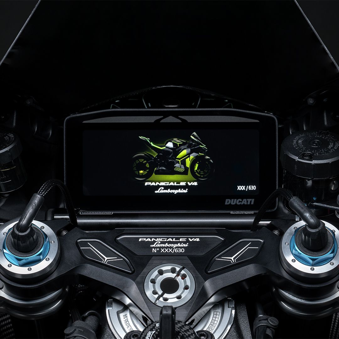 该车型独有元素包括:CNC精工上三星、开机仪表动画(显示车型名称与编号)、收藏证书及涂装匹配的专属车罩(存放于特制箱体)。渐进式编号亦镌刻于铝制点火钥匙牌。发动机铭牌篆刻其名——Desmosedici Stradale。每台Panigale V4 Lamborghini均配备专属定制木箱交付,内含带定制涂装的赛道用后轮支架。