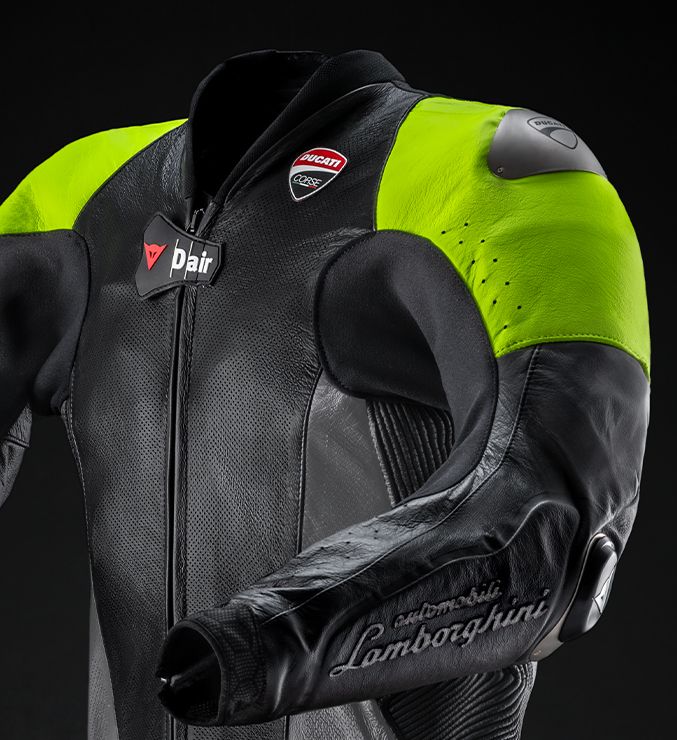 由杜卡迪与Dainese联合打造的专属D-Air连体皮衣,配色设计与摩托车涂装一脉相承。Speciale Clienti版本连体皮衣支持定制配色方案,实现摩托车与兰博基尼超跑涂装的视觉统一。