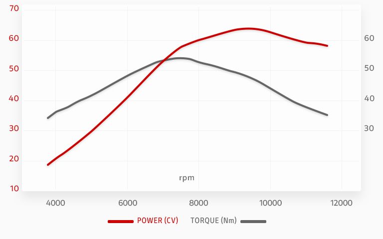 Desmo450拥有宽泛且分布均匀的扭矩曲线,确保即使在低转速下也能随时提供驱动力。这意味着出弯时牵引力更大,车手也不易疲劳。Desmodromic气门正时系统减少了机械损失,并允许使用更极端的凸轮轮廓,以优化燃烧效果。Desmodromic系统还能管理更大的气门加速度,使发动机转速高于传统系统,从而能在同等气门直径下设定更激进的凸轮轮廓,获得更宽泛、更持久的扭矩曲线。