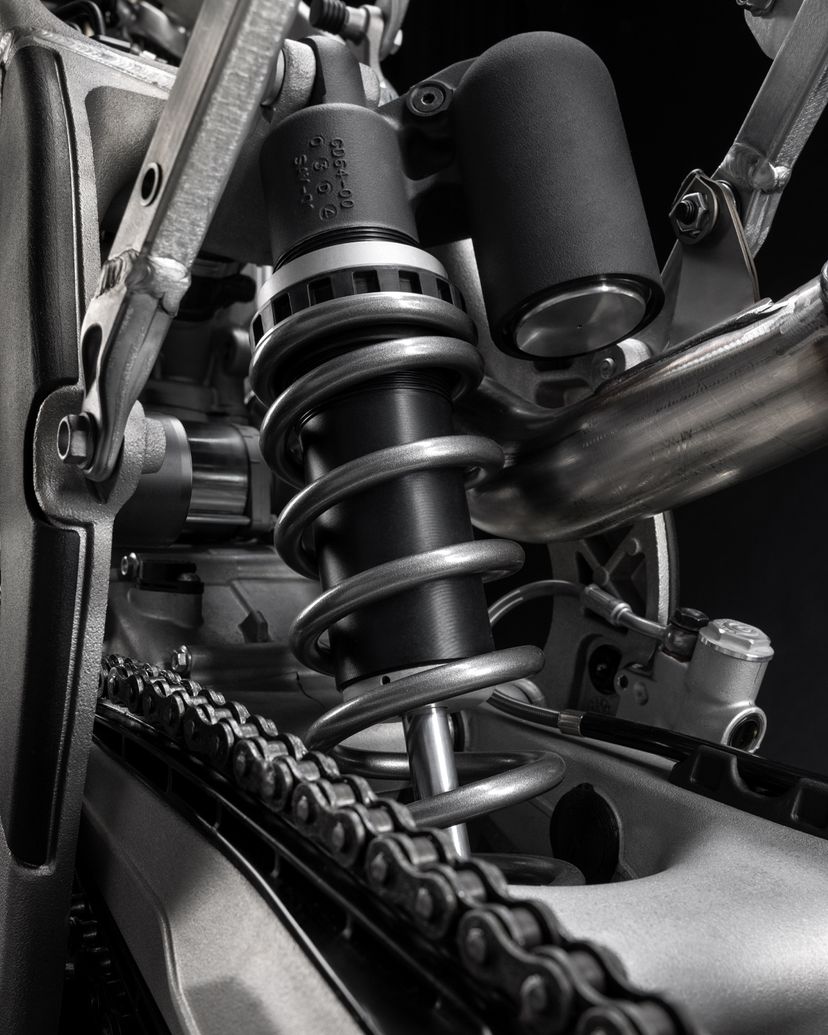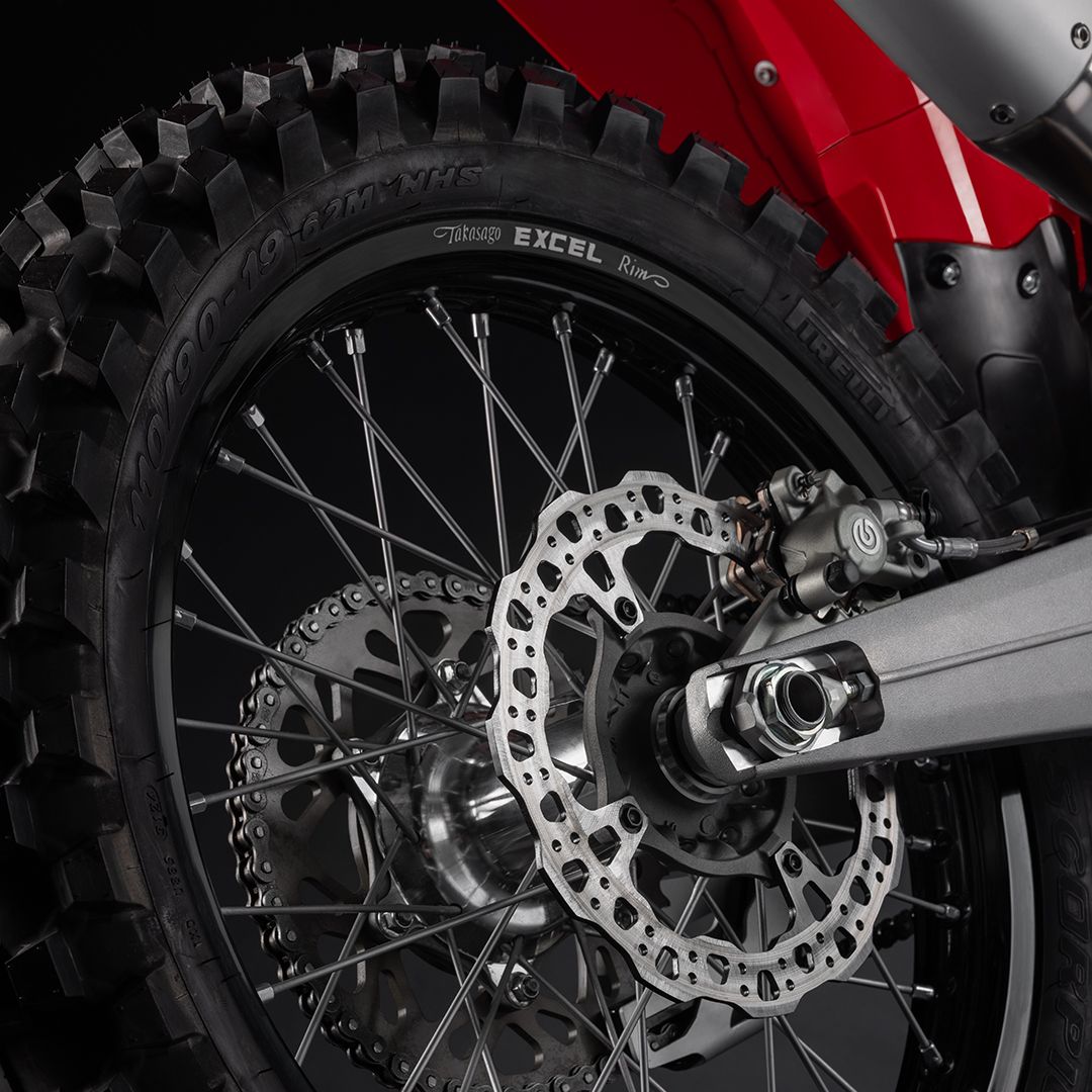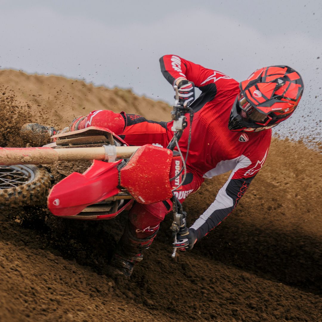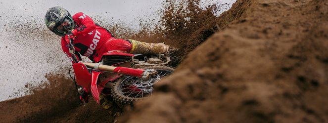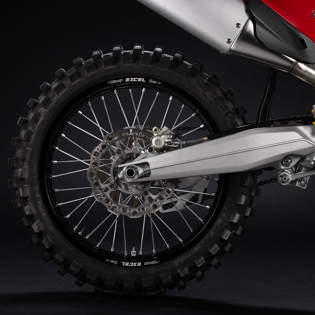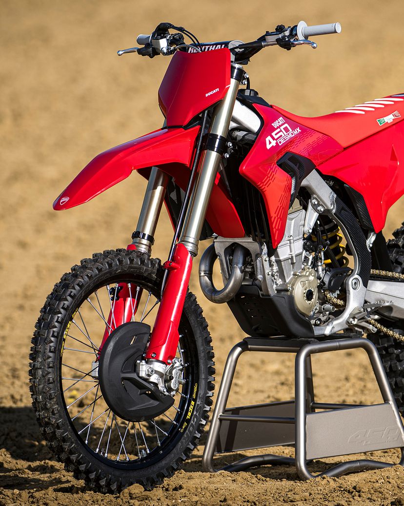 Desmo450 MX发动机是一款排量为449.6 cc的四冲程单缸发动机,配备Desmodromic系统、链条驱动的四气门双顶置凸轮轴(DOHC)以及镁合金发电机、缸盖和离合器盖。得益于Desmodromic气门正时系统,Desmo450发动机的转速可达11,900 rpm,确保起步时加速更猛、驱动更高效。Desmodromic系统无需传统正时系统中的气门弹簧,因而能实现更精准的控制,并减少摩擦损失,从而将竞赛性能发挥到极致。转速更高,动力更强,抢占领先优势胜券在握。事实上,Desmo450 MX在世界越野摩托车锦标赛(MXGP)的首秀中便两战两捷,次次拿下领先入弯的优势。