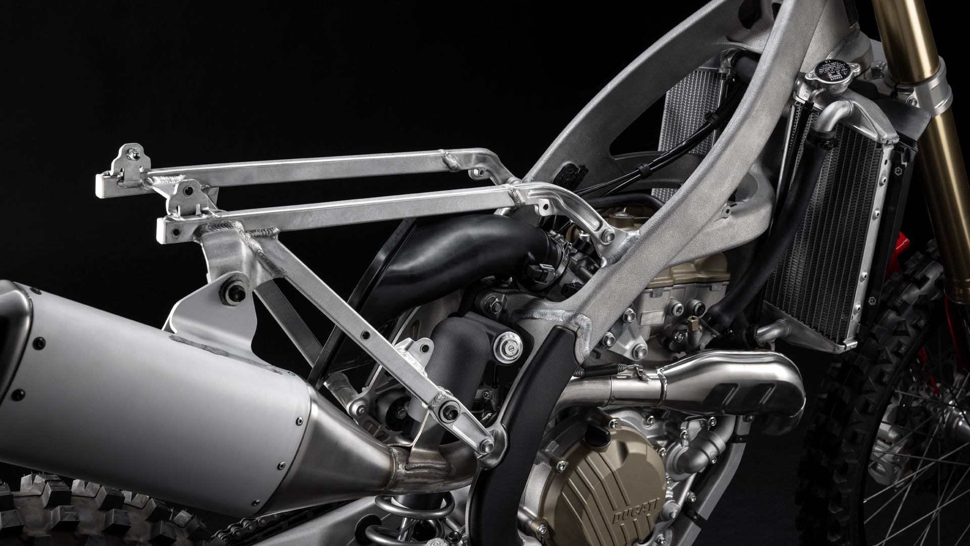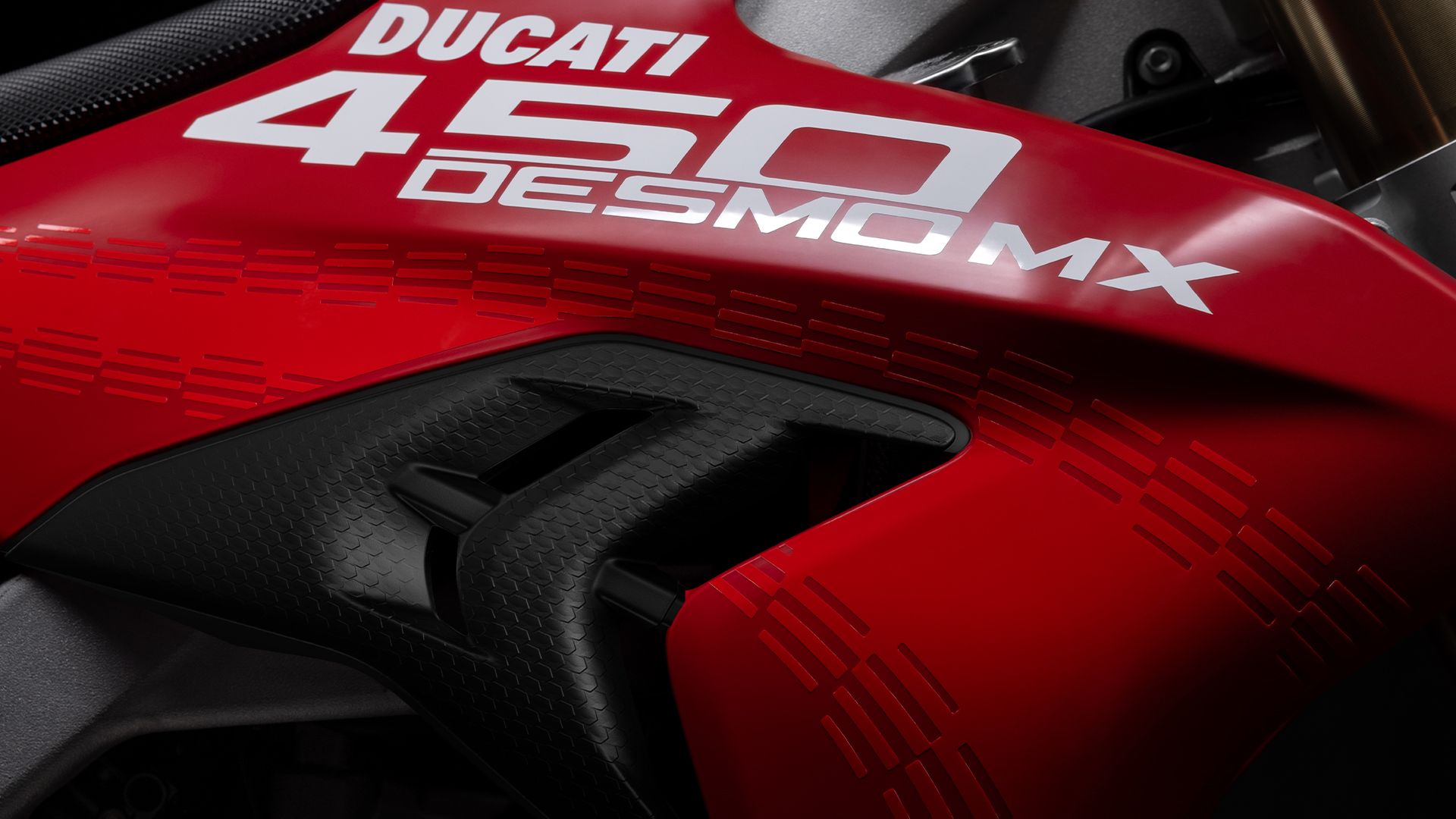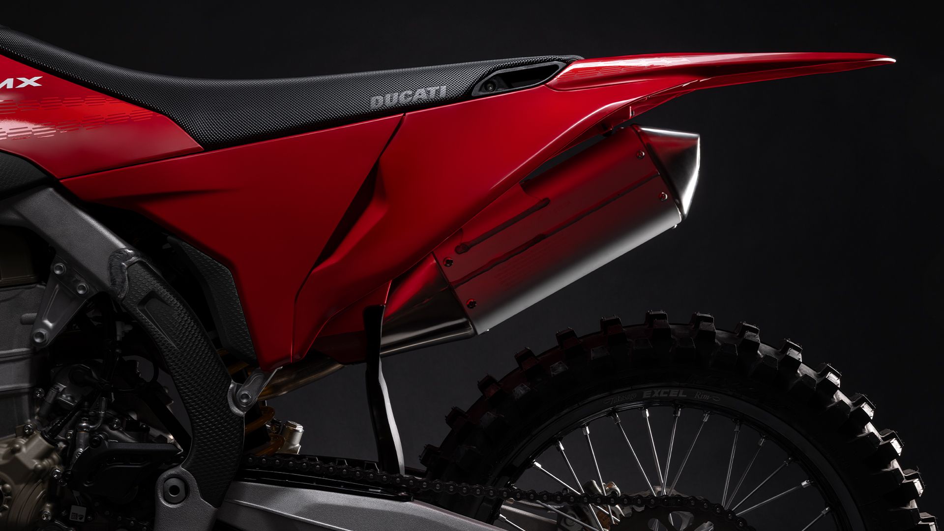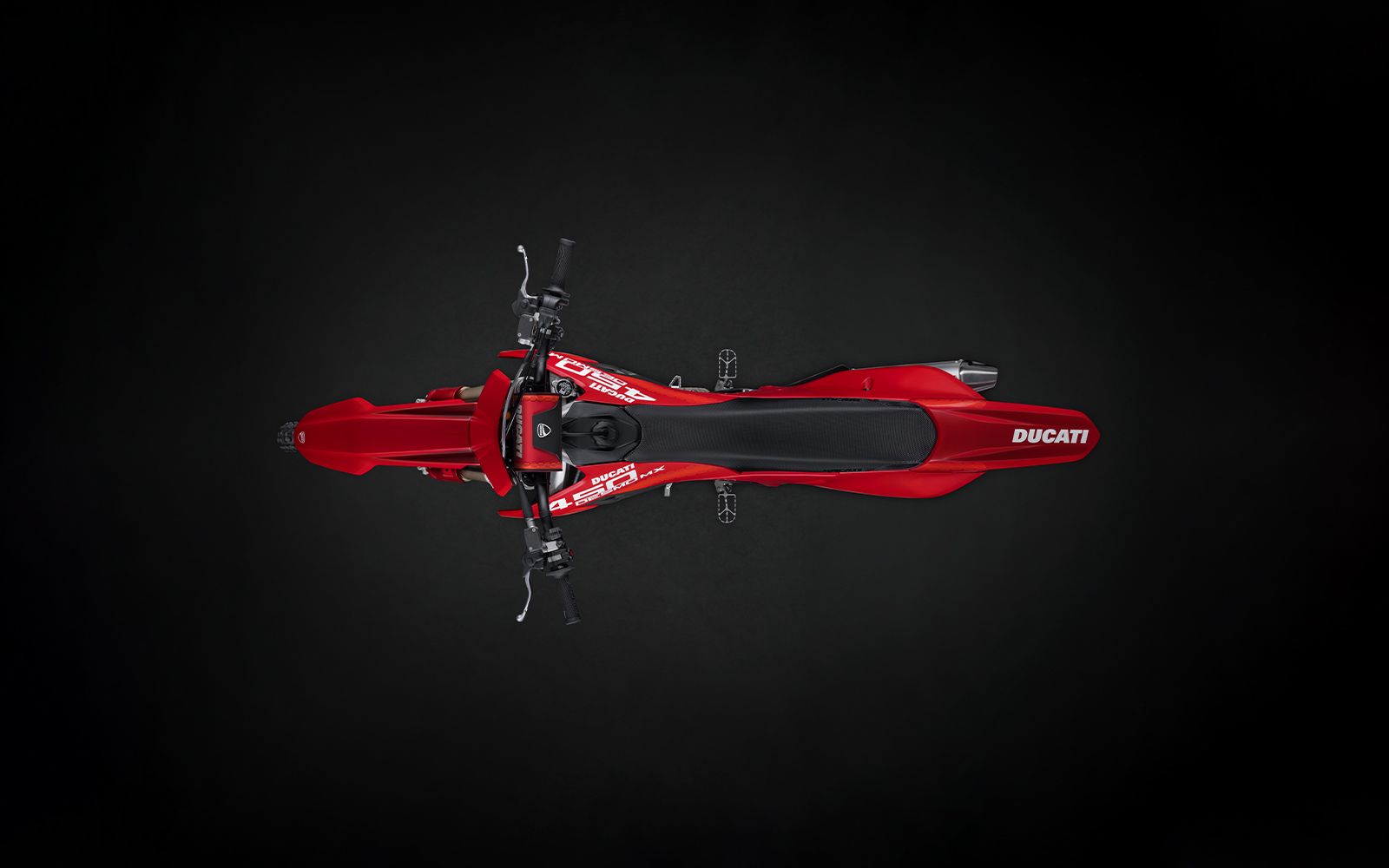 Desmo450 MX围绕其澎湃核心——63.5 hp的 Desmo450 发动机打造,该发动机是越野摩托车历史上首款采用 Desmodromic气门正时系统的四冲程单缸发动机。我们坚持“发动机优先”的设计理念,以发动机塑造整车形态,重新定义了设计概念。