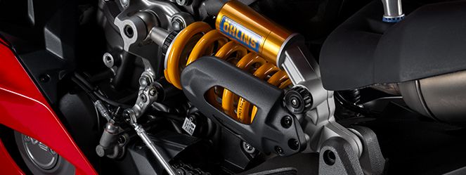 全可调悬挂系统支持骑手个性化调校。Panigale V2基础版配备Marzocchi前叉与Kayaba后减震器,Panigale V2 S版则搭载同级领先配置:Öhlins NIX-30前叉(43mm直径支柱)与Öhlins后减震器。