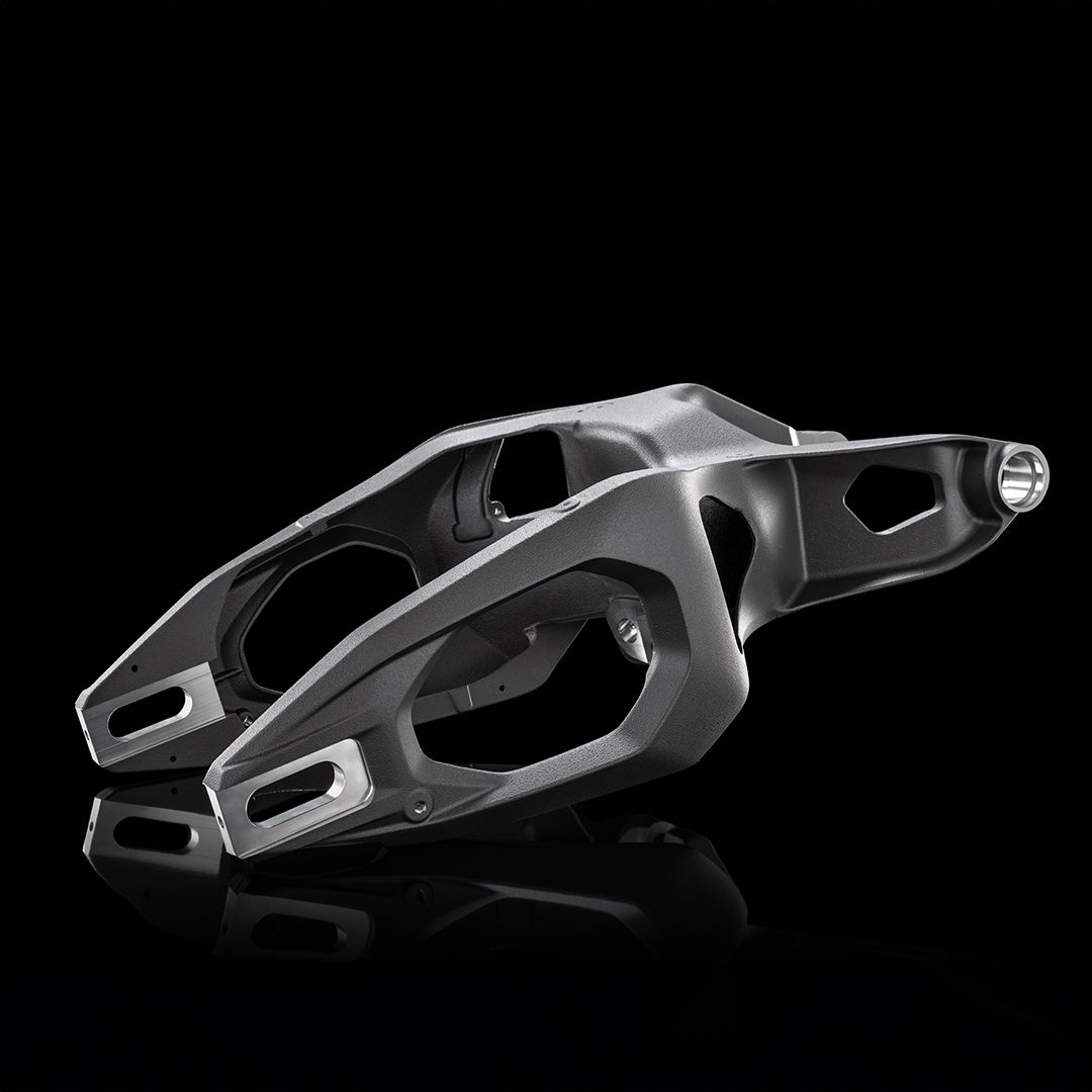全新的杜卡迪中空对称摇臂完美结合了美学与功能性:这一复杂、精致且优雅的结构因其与发动机下方排气系统的配合而在运动摩托车中脱颖而出。 新摇臂的特点在于其侧臂设计更轻,侧面有大型开槽,通过优化结构来满足预定的重量和刚度要求。中空的内部箱式结构进一步减轻了重量,提高效率,并形成了一个非常复杂的空间和开口组合,其中一些开口用美学原件封闭。
