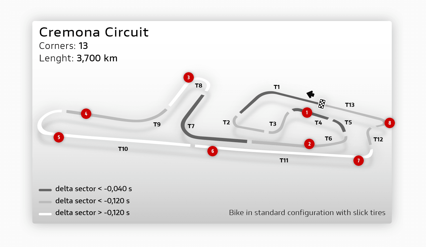 每个弯道都经过仔细检查,根据赛道特定区域的操作,实际性能的提升可能更多或更少。正如上图所示,全新Panigale V4在所有方面都有所改进,但性能提升最大的是突出显示的区域。