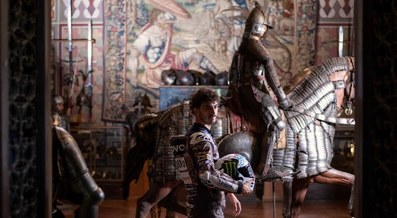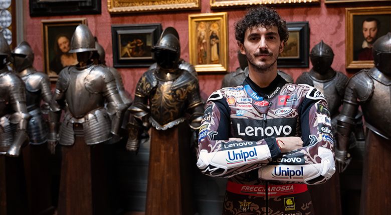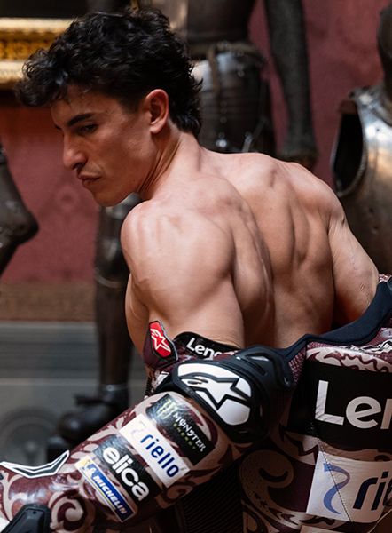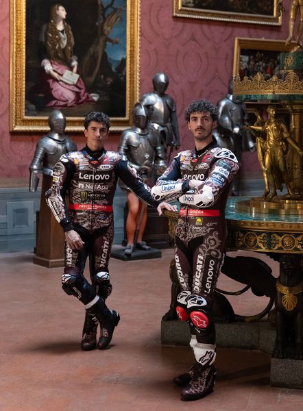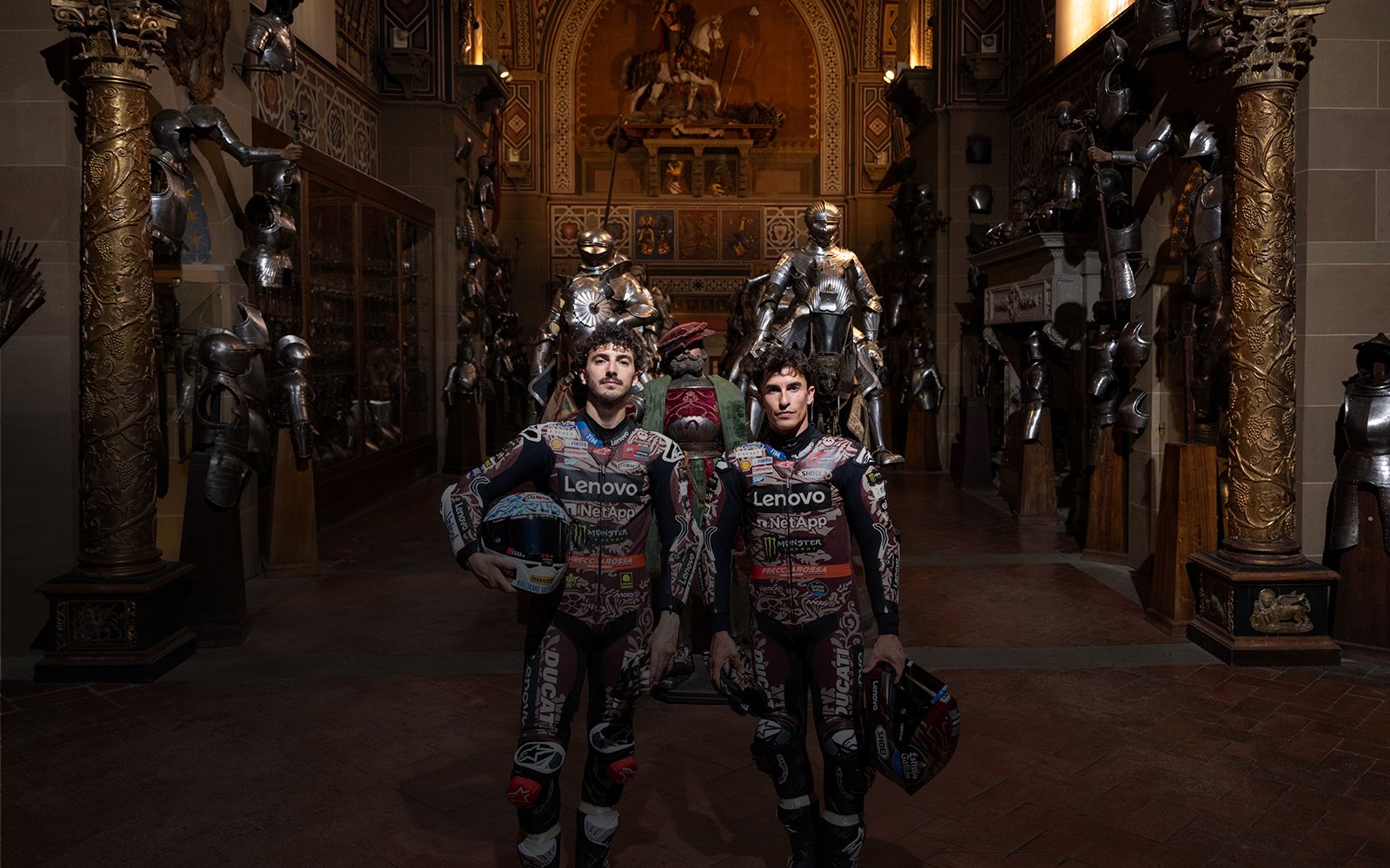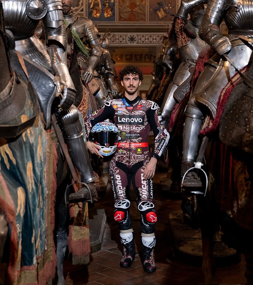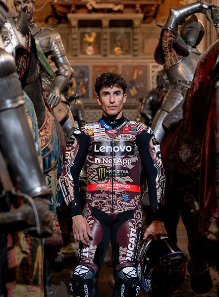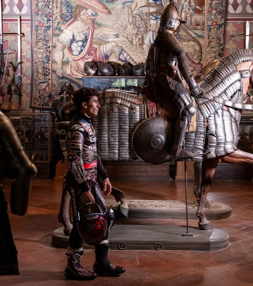 弗朗切斯科·巴尼亚亚和马克·马奎兹是这场穿越时空传奇的两位主角。故事从佛罗伦萨启程,在斯蒂伯特博物馆——这座珍藏世界上顶尖文艺复兴时期铠甲的圣殿中铺陈。如现代骑士整装备战,杜卡迪联想车队的骑手们穿着特制战袍,更衣仪式化为神圣蜕变。古老铠甲仿佛重获生机,骑手们披戴的头盔、胸甲和护手,正以现代设计方式重新诠释:汲取特别涂装纹饰灵感的头盔、赛车服与护手,于此焕新登场。