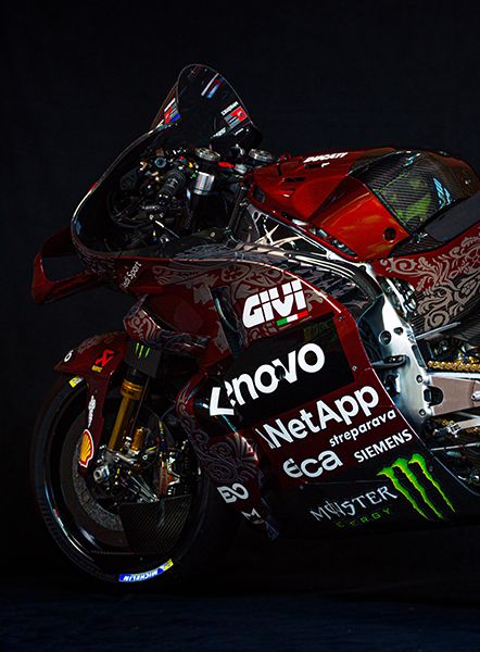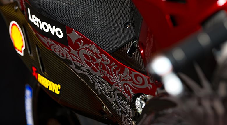 整流罩上跃现两大图腾:狮子与狐狸。直接呼应了马基雅维利在《君主论》中的箴言:“为识陷阱需化狐,为慑群狼须作狮。”受列奥纳多·达·芬奇所绘将领铠甲的启迪,阿尔多·德鲁迪将狮子和狐狸图腾烙于摩托车整流罩上,演绎力量与谋略的完美结合。基于这种双重意象,两位杜卡迪骑手化身为现代骑士驾驭战驹驰骋赛场:欲夺桂冠,既需雄狮之威猛,亦不可缺灵狐之机敏。