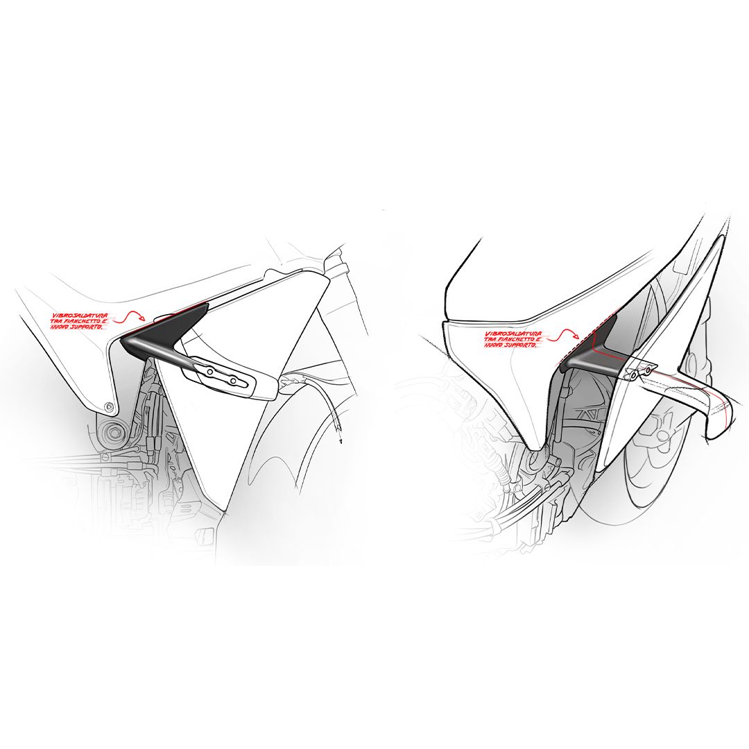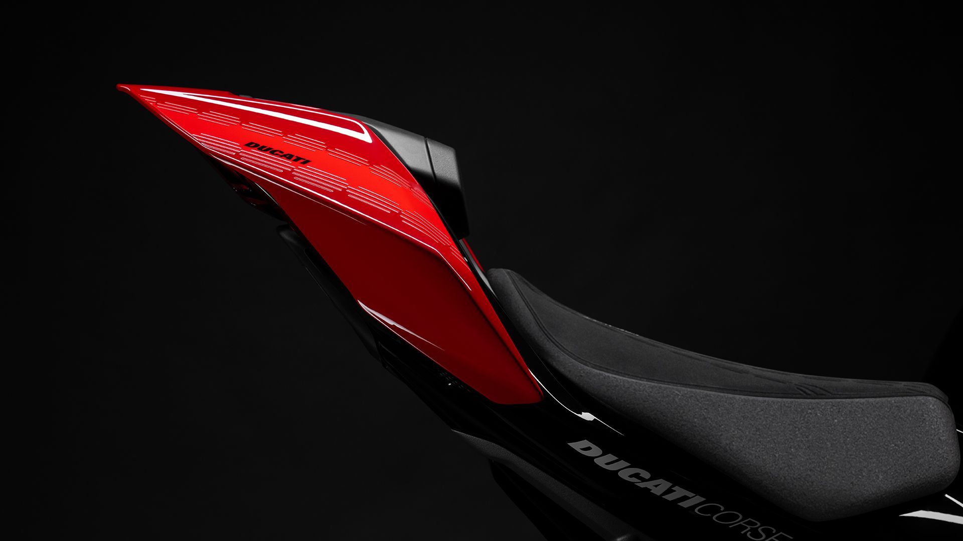 上定风翼采用与新款Panigale V4相同的双翼设计,更好地融入车头,有助于增加垂直载荷(270km/h下增加17kg),并强化了家族式设计风格。下定风翼则沿用上一代车型的单翼设计,可提高稳定性、优化前轮手感,在严苛的骑行阶段也能从容掌控。