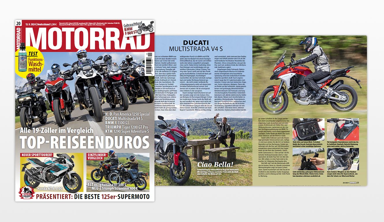 在《Motorrad》杂志2024年第 20期中,杜卡迪 Multistrada V4 S 在与极致探险摩托车的最佳代表宝马 R 1300 GS、KTM 1290 SuperAdventure S、哈雷-戴维森 Pan America 1250 Special 和凯旋 Tiger 1200 GT Pro 的对比测试中获胜。